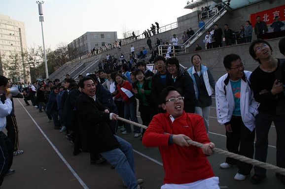 运动会还设立了旨在增进师生交流的师生共同参与项目,其中的师生拔河友谊赛更是把运动会推向了高潮。下午5:30,伴着集体大绳项目的结束,运动会也接近了尾声,闭幕式上,宣布并颁发了男女最佳运动员、男女总分、团体总分等奖项,同学们尽情享受着努力拼搏的胜利成果,大会在一片热烈欢快的气氛中落下了帷幕。