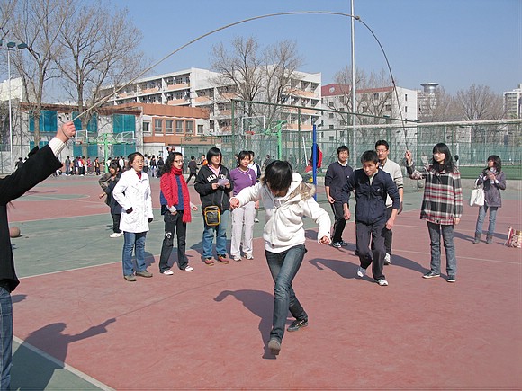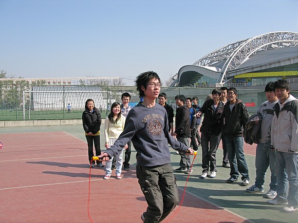 一分钟单摇,4人单摇跳绳接力,4人双摇接力…工商管理班的全体同学全神贯注,有的加油,有的数数,其乐融融。
