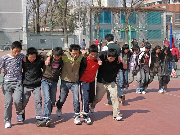 六人七足,考验大家的默契与合作,市场营销与公共事业管理两个班级的同学都表现出了很强的凝聚力,由于专业的特点,两个班级的男女搭配刚好相反,不禁让周围的同学为公管的女同学们呐喊。