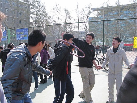 十人联环钻呼啦圈,这是本次活动的最后一个项目,大家手拉手用身体的灵活配合,让呼啦圈在封闭的环里自由的流动。显而易见,男生的相对协调力比女生略差一点,从大家紧张的表情充分的表现出此次活动的竞技性与趣味性。