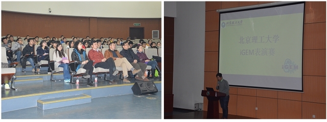 为了营造良好的大学生课外科技创新氛围,培养低年级同学的科研兴趣,ob真人竞猜iGEM两支代表队受邀于2013年12月8日上午,在ob真人良乡校区综教报告厅进行iGEM表演赛。出席此次大赛的有生命学院院长邓玉林,副书记、副院长周连景,现代生物与医学工程研究中心副主任庆宏、空间生物与医学工程研究所马宏、生命学院团委书记王一飞、生物工程系主任科研助理贾海洋同学。会议由生命学院本科生辅导员欧先国主持。