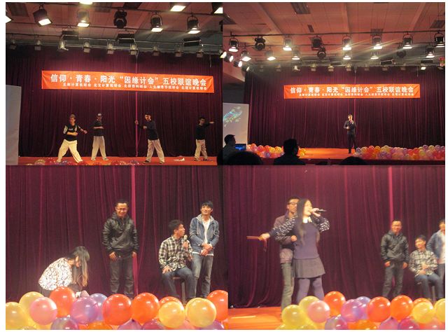 晚会开场,伴随着舒缓悠扬的旋律,来至五大高校的主持人以风趣幽默、轻松活泼的开场白瞬间带动了全场的气氛,在热烈的掌声和欢呼声中,联谊晚会正式开始。