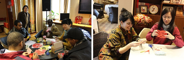 剪窗花是中国百姓喜迎新春的一项传统,外国留学生们看着汉语老师们演示剪纸的做法,也跟着一步步叠、画、剪起来,一件件美丽而意想不到的作品呈现在大家面前。同学们把自己的作品一张张贴到窗户上,顿时间,活动室的年味更足了。
