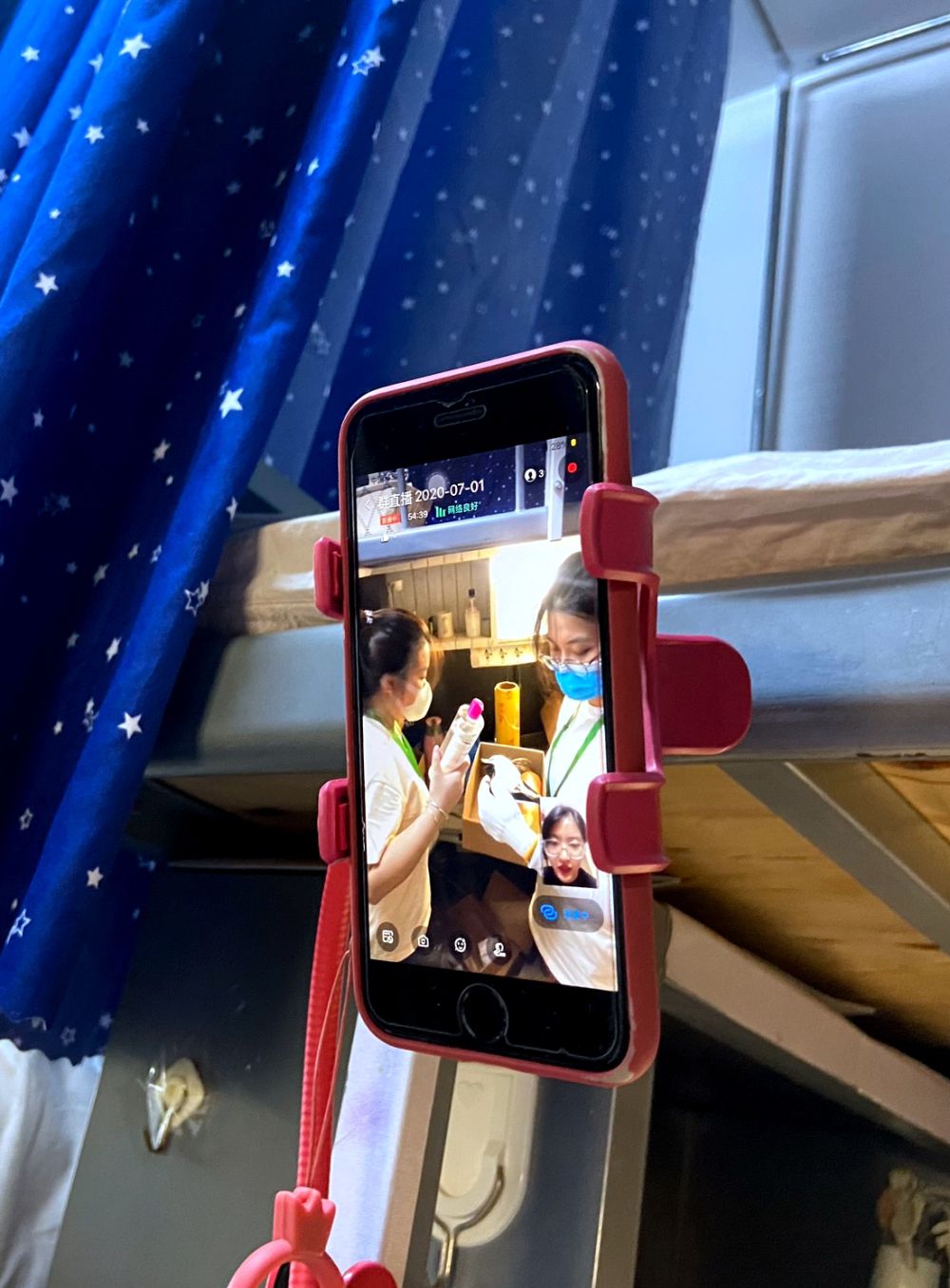 在ob真人竞猜一间女生宿舍里,设计与艺术学院的老师朱彦蒙,正对着手机与屏幕中的一位同学交流。手机用自拍杆架在宿舍床边,视频中的女孩是该学院毕业生孙嘉,身在辽宁家中。