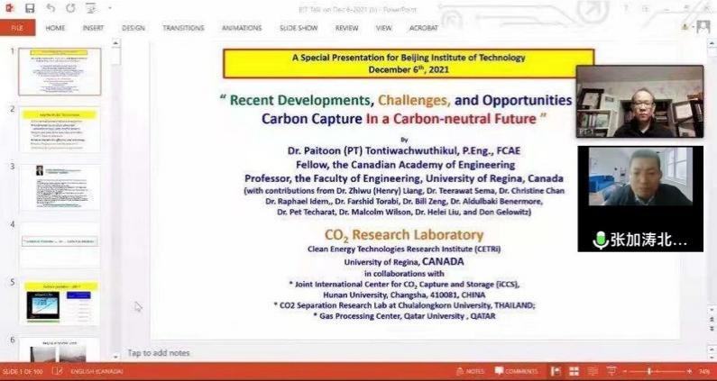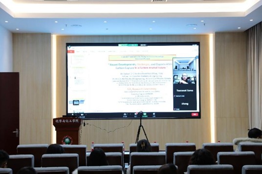 张加涛对Paitoon Tontiwachwuthikul院士做客百家大讲堂表示热烈欢迎,并向Paitoon Tontiwachwuthikul院士介绍了学校及化学与化工学院在“碳中和”领域的前瞻部署和长远规划。