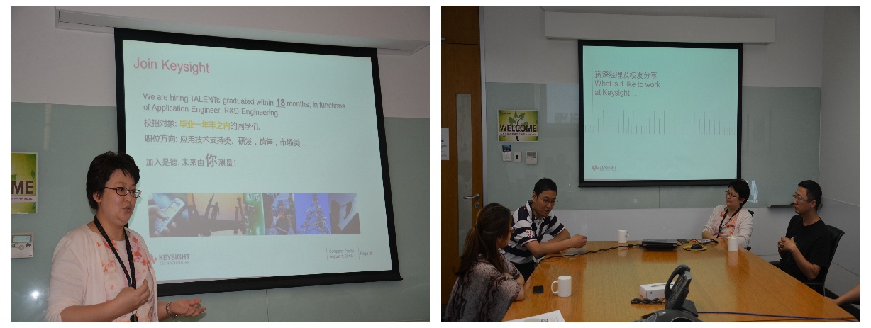 最后,公司的资深经理和校友们与同学们展开了亲切交流。是德科技实验室中国区研发经理孔红伟向大家讲解了公司的科研模式,与同学们分析了在公司里搞科研与在学校的区别。2006届博士校友王铮跟大家一起分享了自己的工作经历,并给予同学们不少中肯的建议。2013届硕士校友张诚跟同学们介绍了自己选择是德科技的理由以及在销售部的工作情况。2015届硕士程亚冰向同学们讲述了自己经过重重选拔加入是德科技的过程。关于同学们关心的企业面试中需要注意的问题,经理们告诉大家,不同部门及不同岗位有不同的就职要求,面试侧重点会有所区别。例如,研发部门就会非常注重面试者的理论知识和过往的项目经验;而市场和销售部门除了看重面试者对专业知识的了解和掌握,同时还强调语言表达能力和解决问题的能力。前辈们中肯的职业规划建议让大家受益匪浅。