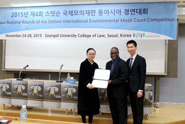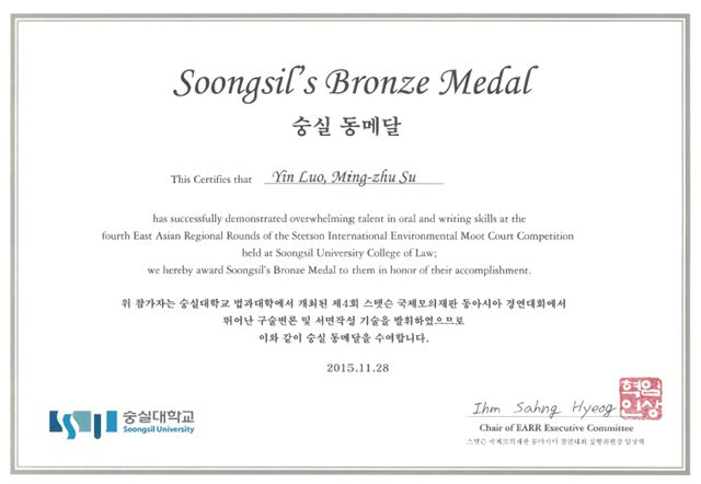 2015年11月24-28日,第20届国际环境法模拟法庭大赛(International Environmental Moot Court Competition,IEMCC)东亚地区选拔赛(East Asia Regional Round)在韩国崇实大学(Soongsil University)举行。ob真人法学院派出的代表队一路过关斩将,位列前三,喜获铜牌。