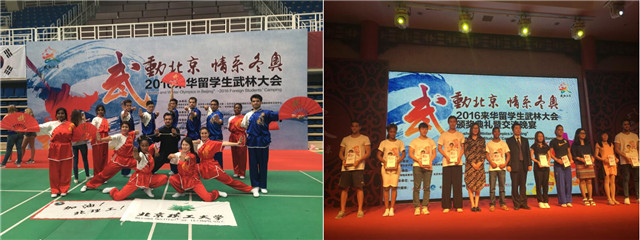 活动分为4个版块,分别是线上武林盟主网络视频评选、线下武术比赛、国际武术文化研讨会以及名家辅导、颁奖典礼暨交流晚宴等。我校留学生中心积极组织学生训练、参赛,首次参赛即取得了优异的成绩,除集体项目外,还获得了视频网络人气奖、优秀组织奖。