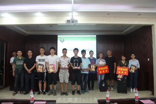 在资助仪式上,教育基金会为到场的每一位新生发放了一份大礼包,里面包含学校资助指南、特制的基金会新生手册和其它学习用品,并为3位新生提供了“梦想启航助学金”资助。教育基金会办公室主任余海滨表达了对2016级海南籍新生的美好祝愿,介绍了“梦想启航助学金”的实施背景和往年的资助情况。“梦想启航助学金”开创了我校新生资助工作的新模式,进一步加深社会各界对我校基金会的了解,完善了学生资助体系,让爱心接力永远传递下去。