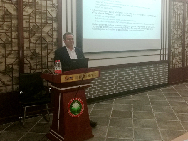 何洪文教授详细介绍了此次学术论坛的筹办组织情况,鼓励研究生积极参加学院组织的各项学术活动,并对Sharkh教授表示了热烈的欢迎。Sharkh教授作了题为“Optimal Coordination of Vehicle-to-grid Batteries and Renewable Generators in a Distribution System”的主题报告。Sharkh教授针对目前电动车辆逐渐普及将带来的车辆智能充电方面的问题,详细地讲述了他和他的团队的最新研究成果。提出了在某分布式系统中Vehicle-to-grid (V2G) 模式下电池和可再生能源发电的协同优化的解决方案。分析指出该方案对于降低能源消耗、提高系统效率、减少用户消费、缓解环境压力等方面都有重要的意义。报告结束后,Sharkh教授与在场的师生进行了深入的交流讨论。