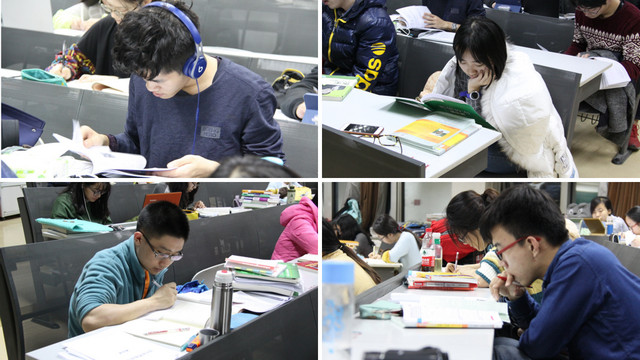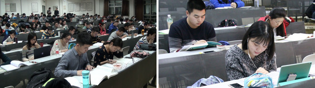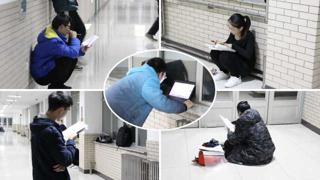 教室里容不下了,他们就在大厅,在走廊,撑起桌子,支起凳子,讨论、记诵。只要有灯的地方,就有他们的身影,他们的勤奋刻苦互相照映,又像一盏盏明灯。