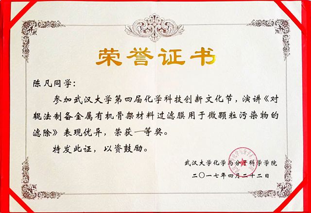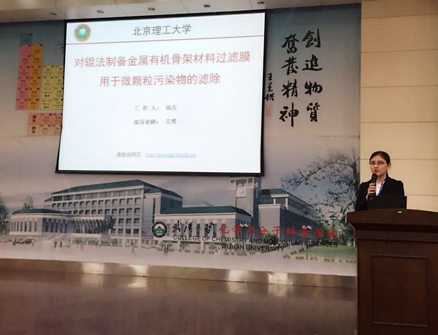 陈凡同学作为ob真人代表进行汇报交流工作,主题为“对辊法制备金属有机骨架材料(MOFs)过滤膜用于微颗粒污染物的滤除”,本课题的指导老师是王博教授。陈凡同学向在场的专家评委和其他高校师生介绍了她所参与的科创工作以及取得的成果,得到了专家评委们的一致好评,并最终获得一等奖的好成绩。文化节同时开展了教师交流、武汉大学实验室参观与交流等多项内容。