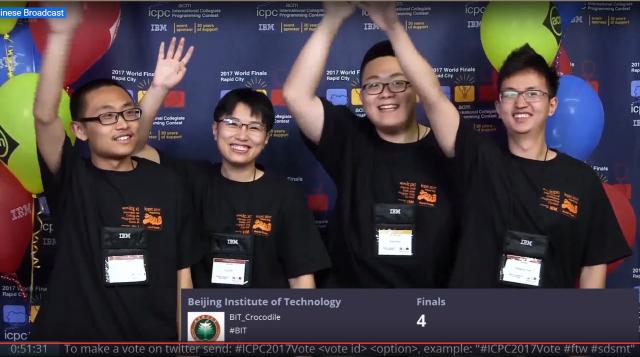 5月24日上午十点,第四十一届ACM-ICPC国际大学生程序设计大赛世界总决赛正式开始。我校队员凭着过人的代码编写速度在比赛开始的第八分钟就顺利通过1题,获得全场第八名的优秀成绩。随后,同学们稳扎稳打,又顺利通过2道题目。然而随着题目难度的逐渐加大,队员们在面临第四题时出现失误,经过多次尝试,才终于通过第四题。赛题第五题是一道较为繁琐的计算几何类题目,队员们迅速整理做题思路,但由于缺少经验,队员们在做题细节上考虑不够周全,与场内多数队伍一样,都在此题上耗费了大量时间。封榜后,虽然队员们一直坚持不懈,不断完善、修改代码,努力到比赛最后一秒,但最终还是因为精度问题成功没有通过题目,总体以通过四题的成绩结束了本次比赛,取得世界排名第56名(不考虑罚时),综合排名第74名的优秀成绩。