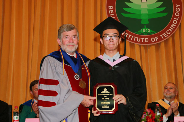 首先,梅文博院长对前来参加典礼的嘉宾及师生表示热烈欢迎,并宣布典礼开始。随后,蒋志湘副院长宣读了获得犹他州立大学经济学学士学位的83名毕业生名单。在优美的毕业音乐声中, Laurens Smith教授、Dwight Israelsen教授和Jason Smith教授为全体毕业生颁发犹他州立大学学士学位证书并一一合影留念,随后,全体毕业生起立,Laurens Smith教授宣布学生正式毕业。Dwight Israelsen教授代表犹他州立大学亨茨曼商学院授予张焱同学2017年度杰出毕业生称号,并颁发杰出毕业生奖牌。
