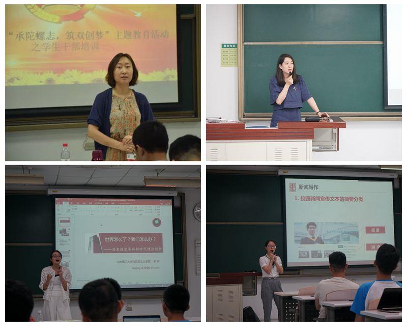 马克思学院教师李京讲授了“世界怎么了?我们怎么办?——历史性变革和新时代理论创新”,从全球视野的角度,向全体参训学生解析了习近平新时代中国特色社会主义思想。她指出,作为新时代新青年,当代大学生应该不断学习、独立思考、自主选择、锻造逆商,承担应有的历史担当。自动化学院辅导员金林剑、向玉兰指导参训学生集体学习了习近平总书记同团中央新一届领导班子成员集体讲话精神、《不辱时代使命,不负人民期望-习近平总书记对青年学子的寄语》《在新时代征程中砥砺前行》共青团改革综述等内容。物理学院副书记副院长王晶晶讲授了学生心理健康的专题讲座,她运用萨提亚冰山模型,教育学生正确认识自我,并关注大学生心理健康教育。党委宣传部韩姗杉作题为《做好校园新闻报道的三把钥匙》的授课,从新闻写作、新闻摄影和新媒体运营三个方面,为学生干部讲授了新媒体运营的工作技巧和注意事项。机电学院团委书记于满作“树立服务意识,培养大局观念”的讲座,她强调,学生干部要“三思而后行”,有自己的思考,不能人云亦云,也分享了与老师同学沟通的技巧,从礼仪规范、气质胸怀和文化品位等方面教导学生干部提升个人素质,做一个好干部。