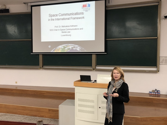 11月6日上午,Hofmann教授着重介绍了有关卫星频轨资源的基础专业知识和联合国中极其重要的国际组织“ITU”的目的、任务、历史与发展。下午,Hofmann教授又以空间法的五大条约为基础,为同学们细致讲述了空间法的基本知识,并介绍了卢森堡大学对于空间法专业的学习情况。三期讲座围绕空间法法律框架为同学们进行了梳理,法学院的同学们表示经过此次讲座受益匪浅。