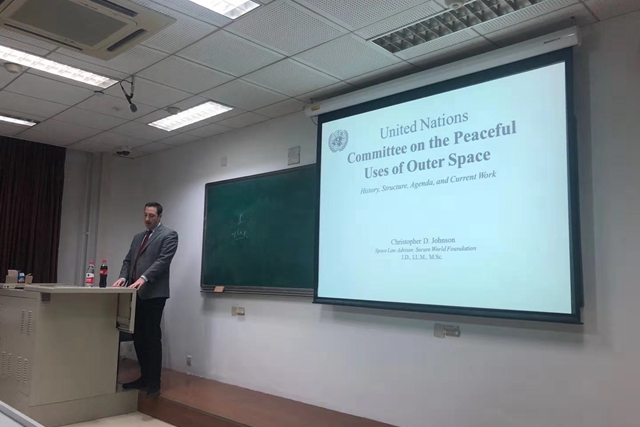 此次讲座,Christopher顾问主要介绍了联合国和平利用外层空间委员会(UNCOPUOS)的基本情况,包括和平利用外空委员会的历史、组织结构、日常工作事项和议程以及当前的工作情况。在讲座中,同学们反响热烈,积极发言讨论。通过Christopher对和平利用外空委员会以及其与联合国其他组织的结构和联系的讲述,同学们对联合国和空间法有了更深刻的认识。