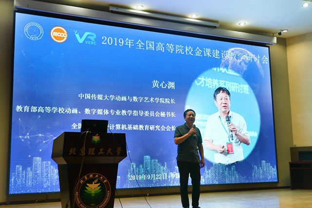中国传媒大学动画与数字艺术学院院长、教育部高等学校动画数字媒体专业教学指导委员会秘书长、全国高等院校计算机基础教育研究会会长黄心渊教授从金课建设的发展现状以及联盟和基础教育研究会所做的工作方面,介绍了有益的参考意见,为大会研讨提出了富有建设意义的研讨主题。