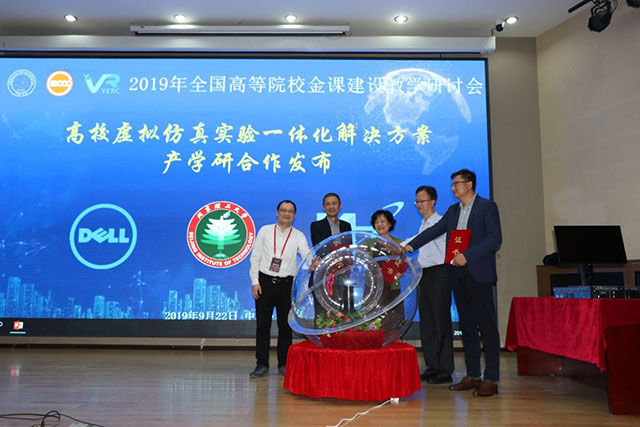 此外,本次会议的共同协办方戴尔科技集团和北京理工科惠科技发展有限公司,联合发布了“高校虚拟仿真一体化解决方案”,戴尔科技全球副总裁林浩先生与北京理工科惠总经理张晓炜先生作为双方企业代表,与ob真人竞猜国家级虚拟仿真中心代表李凤霞教授一并,接受了CMOOC联盟联席会秘书长张龙先生颁发的《一体化解决方案产学研合作协议书》,三方协作倾力打造的“一体化解决方案”,不仅可助力高校虚拟仿真中心建设,支撑各学科金课申报与教学改革,还为虚拟仿真实验生态建设和智慧教育深度发展提供了切实可行的一体化解决方案。启动仪式上,首批“一体化解决方案”用户单位代表深圳大学教务部主任袁磊教授代表高校用户做了主题发言。戴尔全球副总裁和理工科惠总经理张晓炜分别做了主题演讲。