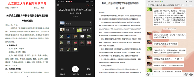 2月4日,根据学校疫情防控总体安排,学校决定延期开学不停课,教师按原上课时间通过网络教学授课。机械与车辆学院第一时间成立由学院院长、党委书记担任组长的网络教学保障组,吹响了这场“网络教学战役”的集结号。1-4周内96位授课教师,117个教学班,覆盖7666名学生,面对艰巨的网络教学任务,学院充分借助专业和研究所基层教学组织,紧密依靠教师,多次召开联席会议,及时传达学校要求,加强部署和联动,将所有教师的思想统一到学校的大局工作中。学院相继开展了“明标准、搭平台、建渠道、塑模式、享资源、勤督查、重反馈、保服务”八项工作,全力准备迎接开学第一课。