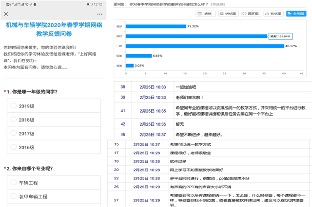 “第一次直播授课,全班46名同学全部准时进入课堂”“第一次网课,授课、图文声交流相当完美”“远程教学第一次上课,打卡签到情况不错,圆满”,这是机械与车辆学院胡耀光、李莉、何永熹老师在朋友圈内分享的第一周网络授课的体验。类似这样的分享还有很多,简短的文字、简单的言辞背后是老师门倾心教学的全力付出,收获的是“网络教学战役”首战的初步告捷。