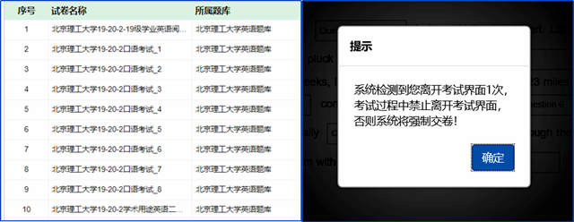 课程负责人在考试系统完成了2套笔试和8套口试试卷的设计和审核,并利用试卷随机抽取、题目顺序异序、答案异序等手段严防作弊。同时,考试过程中,对切出考试作弊的学生进行警告和强制交卷处理,禁止学生在系统上复制粘贴、禁止学生跳出考试页面查询答案,利用防切屏功能,保证学生在考试过程独自完成作答。
