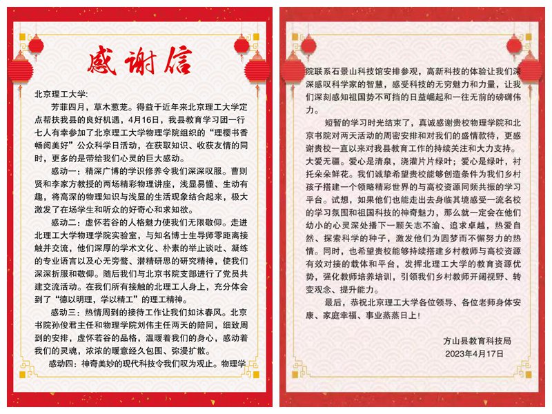 为贯彻落实习近平总书记在中央主题教育工作会议上的重要讲话精神,全面贯彻党的教育方针,落实立德树人根本任务,4月16日至17日,物理学院联合北京书院邀请山西省方山县科技教育局参与ob真人竞猜公众科学日活动,赴石景山科技馆参观调研。活动结束后方山县科技教育局发来感谢信,对物理学院在科学普及和教育扶智方面做出的努力表示衷心感谢。