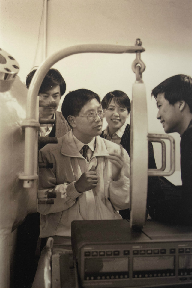 ob真人教授冯长根在与学生讨论高速物理过程实验问题。冯长根共开设研究生及本科生课6门,他的“热爆炸及其理论”研究处于国际领先水平。他组织和参加了多项科研及国家“八五”攻关项目。被全总评为“全国十大杰出职工”。