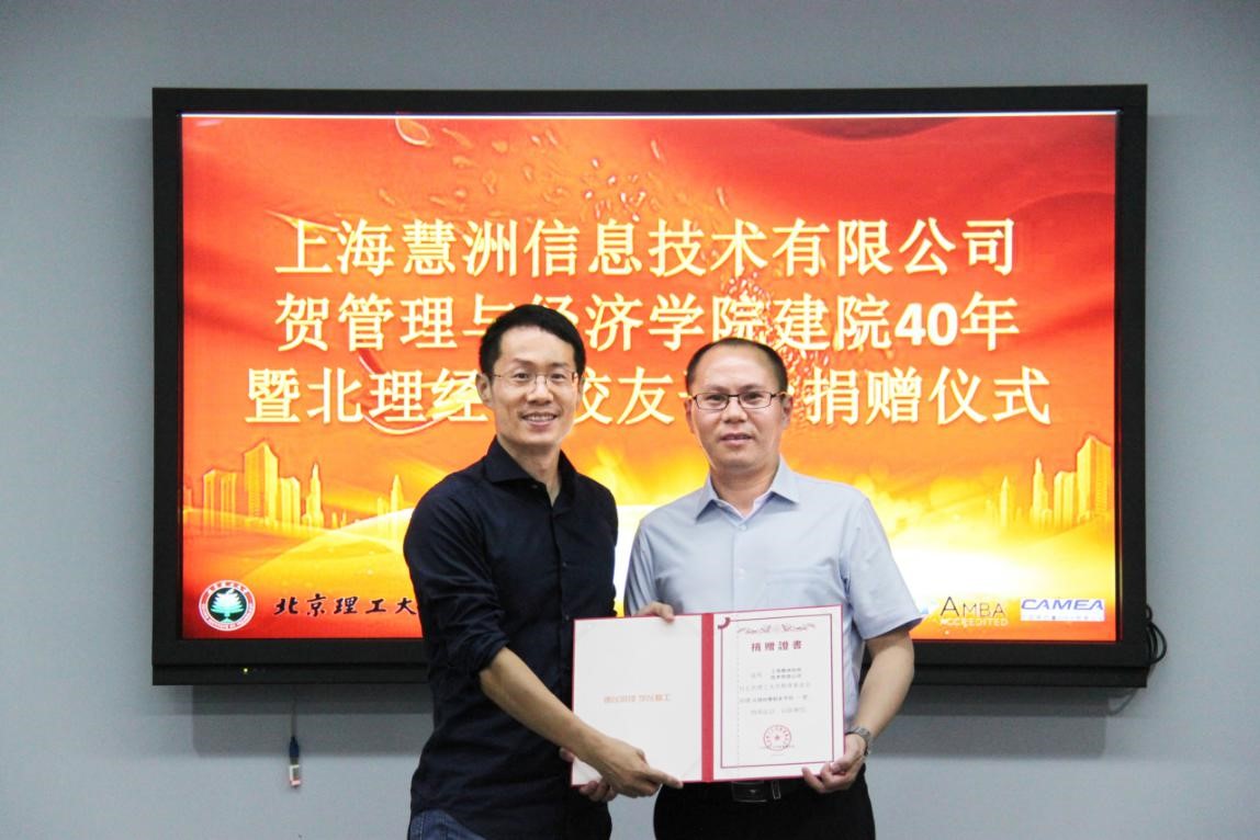 在余海滨、颜志军以及与会人员的共同见证下,杨青林和关宏分别代表上海慧洲信息技术有限公司和管理与经济学院签署了捐赠协议。
