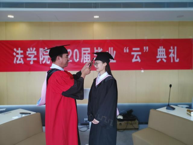 法学院唯一的一位2020届在校的毕业生王瑞瑞同学在现场接受院长李寿平教授的拨穗正冠。