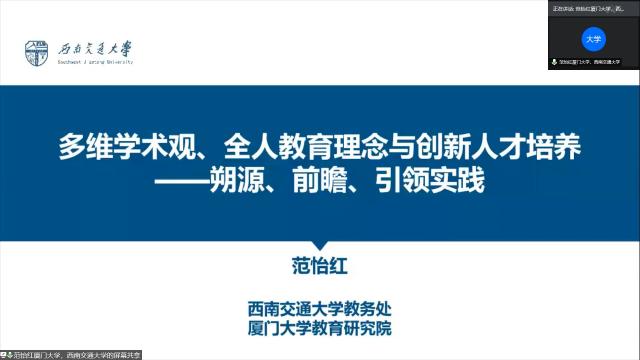 范怡红以《多维学术、全人教育与创新人才培养:朔源、前瞻、引领实践》为题作大会报告。她认为建设创新型国家需要大学使命的不断延伸。通过溯源多维学术观,结合全人教育与创新人才培养进行思考,提出了人才培养从重专业发展到重创新力与综合素养的实现路径。并基于多维学术观与全人教育理念对创新型课程案例进行分析,探索了如何有效地激发教师与学生的潜力与创造性。