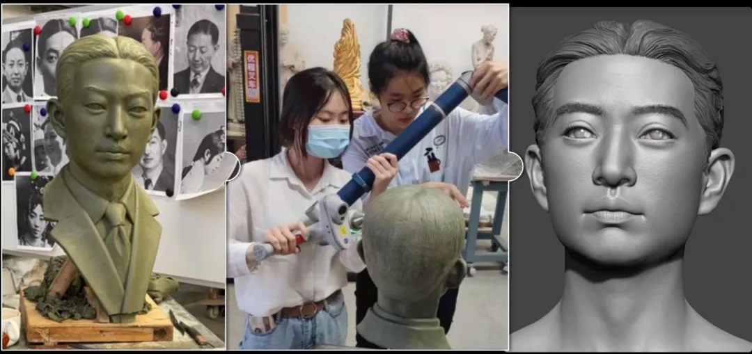 由于无法采集到梅兰芳先生的真人三维数据源,在收集了大量梅兰芳先生的照片作为数字资产构建的参照后,团队邀请中央美术学院的师生以历史照片为依据完成了梅兰芳先生的实体肖像,并通过技术团队与雕塑团队的反复磨合,最终完成了以三维数字化为目标的真人雕像数字人制作。