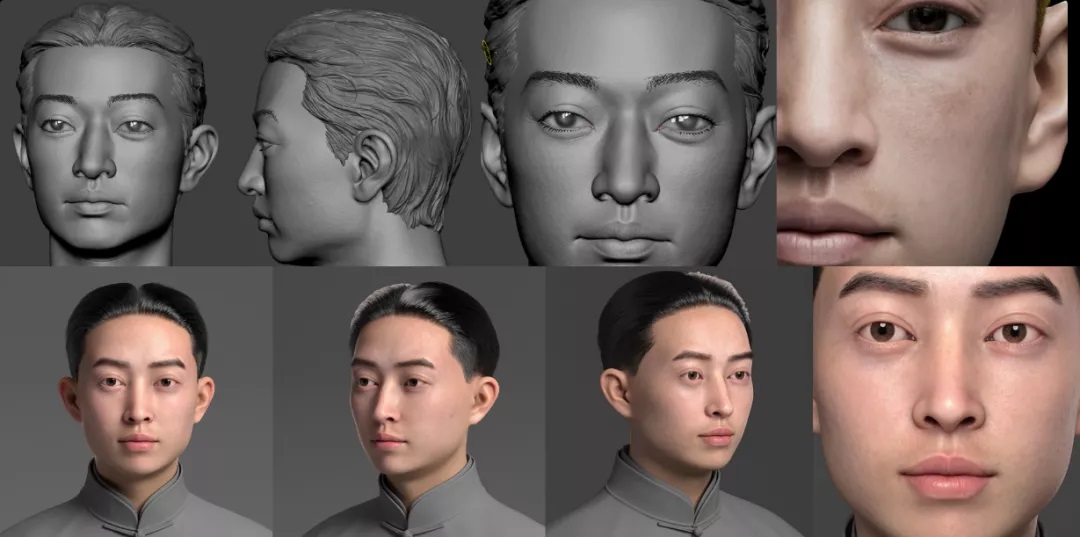 团队用高精度激光扫描仪对雕像进行扫描,从而获得梅先生的基础表情。在得到基本扫描模型后,通过数字化雕刻流程对模型的细节进行处理。因为雕塑艺术本身不够具象,因此团队还需要在在模型骨像、皮肤细节、毛发细节、眼神光等细节进行补充完善。