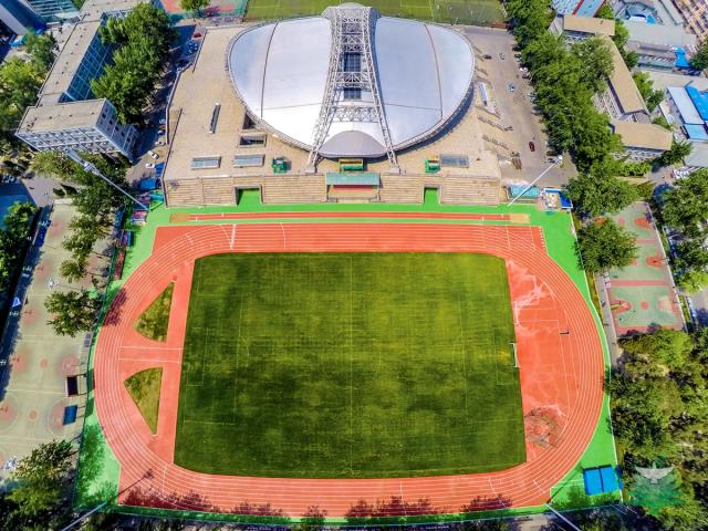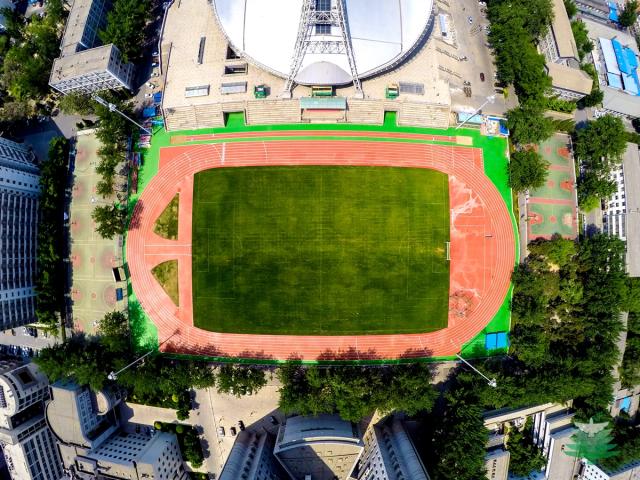 首先从高空视角一窥运动场的全貌,新换种天然草皮的足球场翠绿如茵,与橙红色的跑道形成了鲜明的对比。