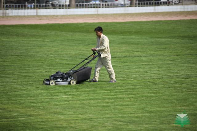 标线喷涂与足球场草坪的平整工作高效率同步进行