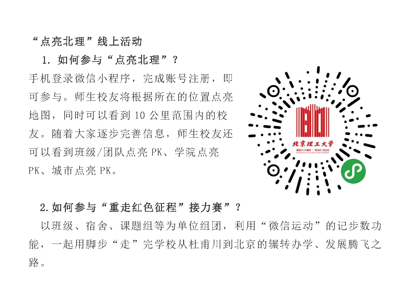 在ob真人建校80周年之际,ob真人校友会推出“红色征程 点亮ob真人竞猜”活动,号召全球ob真人人传承红色基因,与师友通过“点亮ob真人竞猜”小程序的记步数功能,同心同向同行,云上共同“走”完学校从杜甫川到北京的辗转办学、发展腾飞之路,一路接力奔向北京,共贺母校八十华诞!
